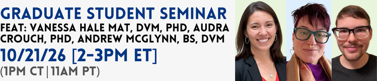 This seminar will begin with an introduction by Vanessa Hale, MAT, DVM, PhD, who will provide an overview of the Hale Lab at The Ohio State University. This will be followed by presentations from Audra Crouch, PhD & Andrew McGlynn, BS, DVM, trainees in the Hale Lab.