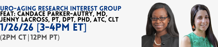 Join us on Monday, January 26 at 3:00 PM ET (2 PM CT | 12 PM PT) to hear from Candace Parker-Autry, MD (Wake Forest University School of Medicine) who will speak on geriatric urinary incontinence and Jenny LaCross, PT, DPT, PhD, ATC, CLT (University of Michigan) who will present From Clinic to Community: The Morphological Impact of Aging and Physical Activity on the Pelvic Floor.